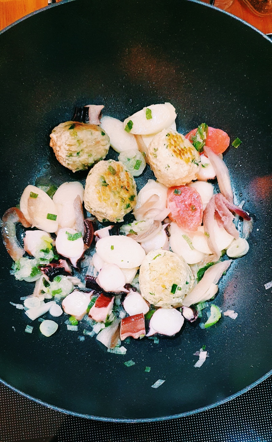 1. 웍에 올리브유를 두르고 불려두었던 떡볶이떡과 굴림만두를 넣어 익혀줍니다